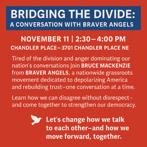 Bruce MacKenzie of Braver Angels will present insights on partisan polarization in the U.S., its causes, and why it is not sustainable. He will discuss what we as citizens can do to depolarize our country.